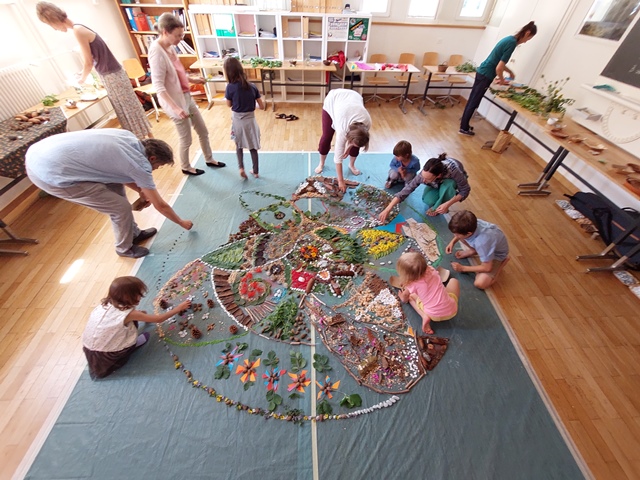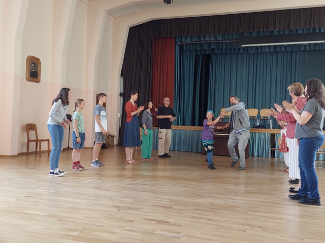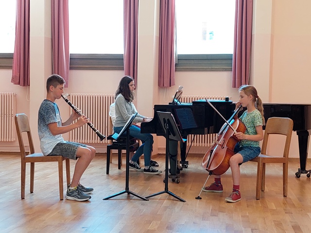 Am Samstag Vormittag durften wir bei den angebotenen Workshops teilnehmen: es wurde gesungen, improvisiert, getanzt und ein großes Mandala gelegt. Nach dem feinen Mittagessen aus der Schulküche gab es ein Podiumsgespräch und dann das große Jubiläumskonzert, bei dem auch unsere vier Musiker*innen auftraten: Lina, Namu, Leonard und Luise spielten zwei Sätze aus einem Trio von Julius Klengel. Trotz Aufregung gelang alles sehr gut, und sie erhielten viel Applaus und Anerkennung! Der Kinderchor sang und spielte ein Till-Eulenspiegel-Stück, und das große Orchester nahm uns in sieben Tänzen auf eine Reise um die Welt mit.